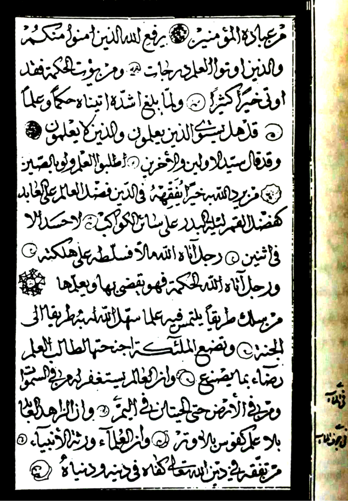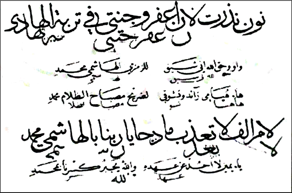 - جاء في نهاية مخطوطة (لمحة المختطف إلى صناعة الخط الصلف)[23] لحسين بن ياسين الكاتب من علماء القرن الثامن الهجري/ الرابع عشر الميلاد[24]، تقريظ كتبه أحد تلامذة المصنف، يقول فيه: