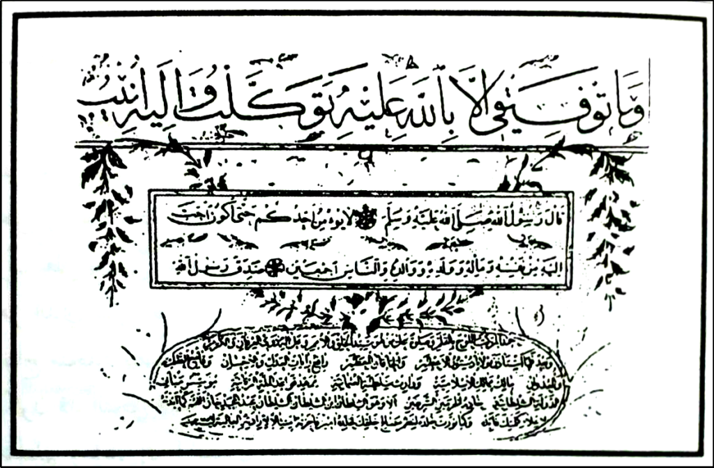 «قد اتّفق الأساتذة الكاملون عند مجلس الجمعية والحاضرون على أن راقم هذه القطعة المباركة المستحسنة مستحق بالإذن والإجازة، وضعوا الإجازة والإمضاء في مجلس الدعاء، كما هي عادة الأسلاف أسبغ الله نعمه عليهم بحرمة حمعسق فأجزته معهم كما أجاز لي أستاذي بتنميق هذا التبريك والأوصاف أعني بهم مير مصطفى حلمي أفندي يسر الله له مراداته بتوفيقه الصمدي وعليه أعانه الهادي وأنا معلمه المذنب السيد علي الحمدي[96] كاتب السراي السلطاني المعروف بحافظ كلام الرحمن، فأكرمهما بالعفو والغفران لسنة[97]. 1263.[98]