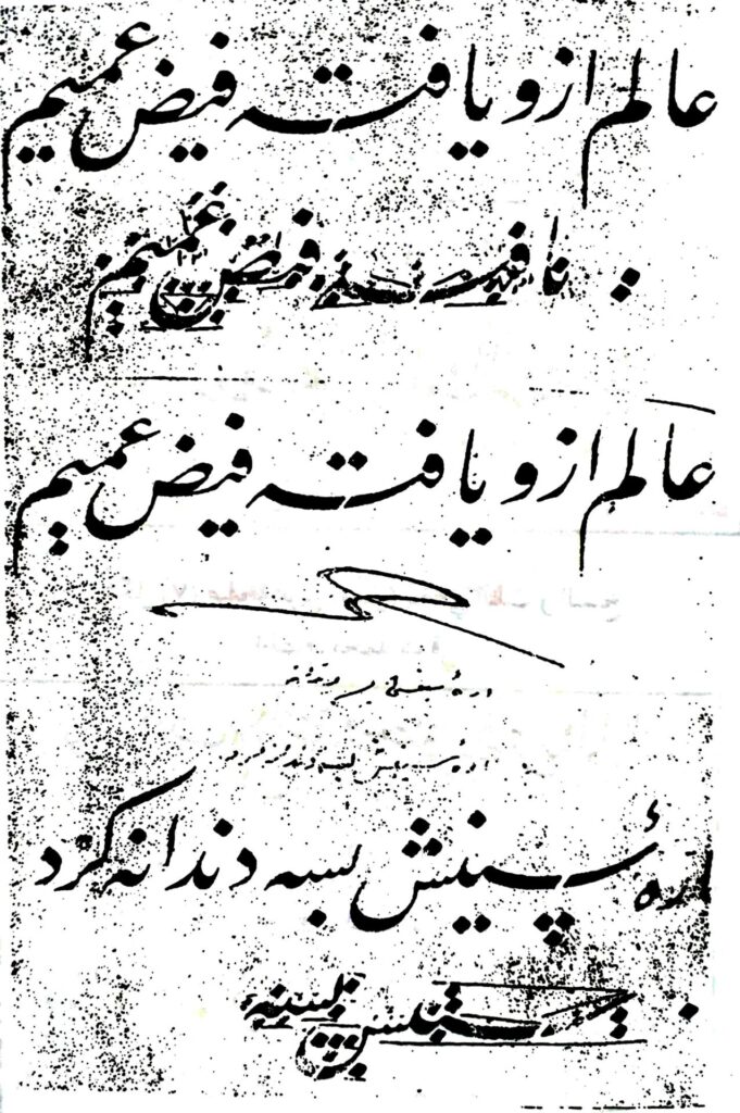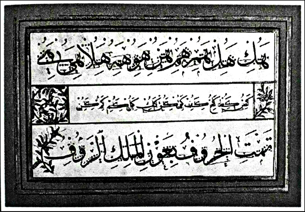 [104] هو درويش محمد آغا الفيضي البغدادي، من أعيان بغداد، أخذ الخط عن الخطاط اسماعيل مكي آغا، ونال فيه إجازات عديدة، من أشهر الخطاطين البغداديين في عصره. الأعظمي، المرجع نفسه، ج2، ص620.