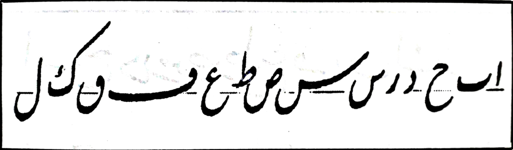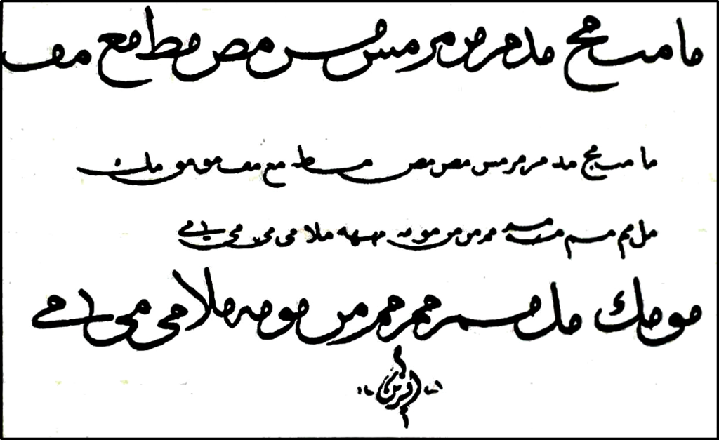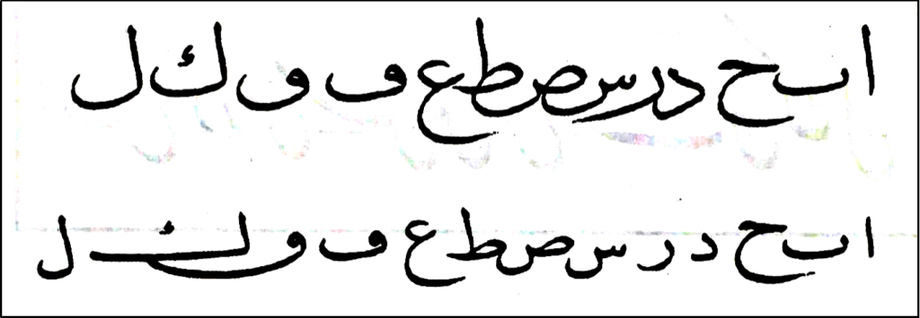 وعادة ما يبدأ معظم الأساتذة بتعليم تلاميذهم خطي الثلث والنسخ بشكل متزامن، ويقوم بتدريسهما أستاذ واحد، لما يظهر من التقارب الواضح في رسم حروف الثلث والنسخ (شكل 3)، أما خط التعليق فتكون دروسه مستقلة ويعطيها أستاذ غير أستاذ الثلث والنسخ[80]، لما له من خصوصية في قواعد كتابة حروفه ورسم صورها (شكل 4).