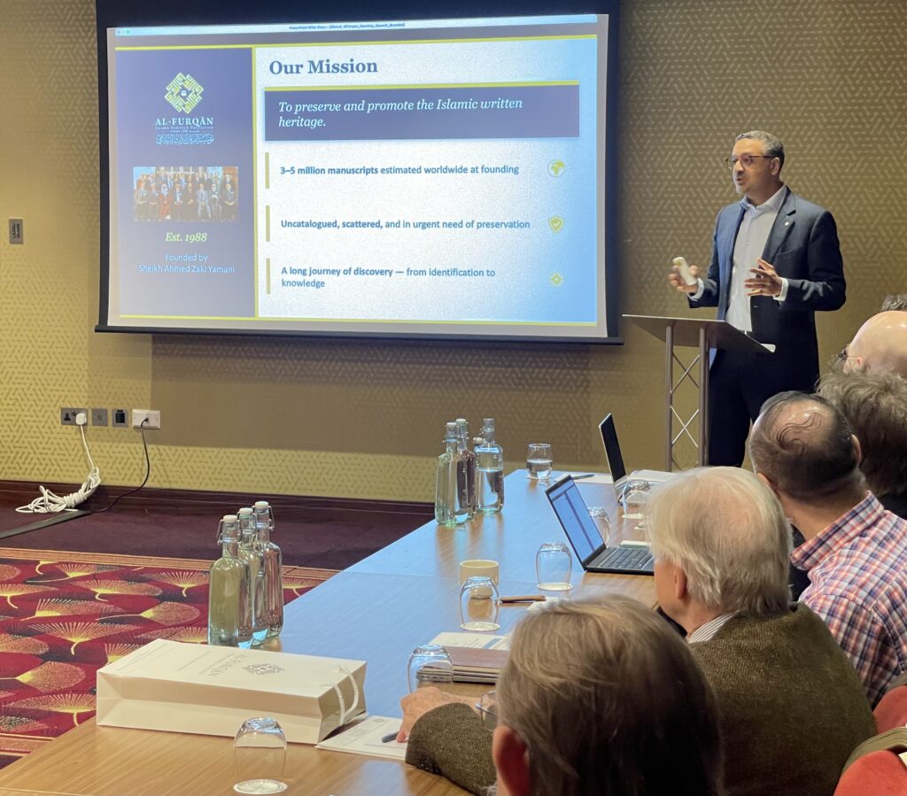 The meeting commenced with the opening words of Mr. Sharaf Yamani, Chairman of Al-Furqan Foundation. He said: "Our challenge is managing a large volume of data and finding the most efficient way to simplify and expand access to it. Over the past four decades, we have tried to keep pace with technology—first by improving our cataloguing processes (making them more efficient), then by digitising those catalogues and primary sources, and eventually by making them accessible online. What once required months of travel and correspondence can now often be done in minutes without leaving your desk."