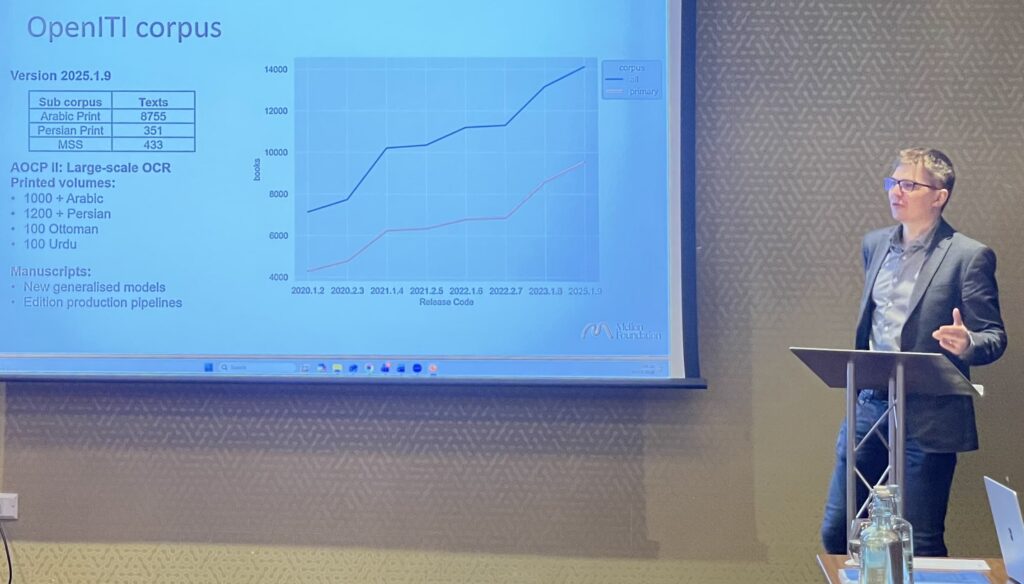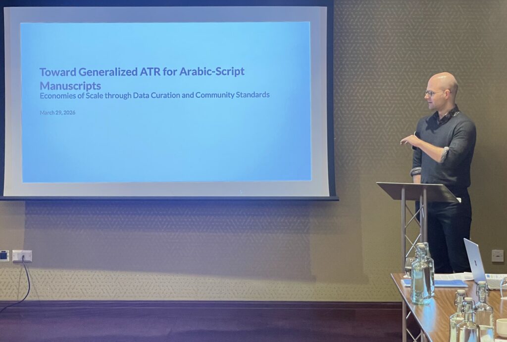 The second speaker was Benjamin Kiessling, who gave a presentation entitled "A Strategic Pathway toward Generalized ATR for Arabic-Script Material, and the Critical Interaction between AI Mechanics and Humanities Practice".